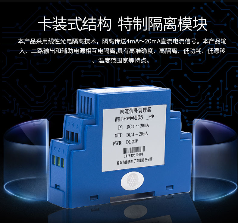 本产品采用线性光电隔离技术,隔离传送4mA~20mA直流电流信号。本产品输路输出和辅助电源相互电隔离,具有高准确度、高隔离、低功耗、低漂移温度范围宽等特点。