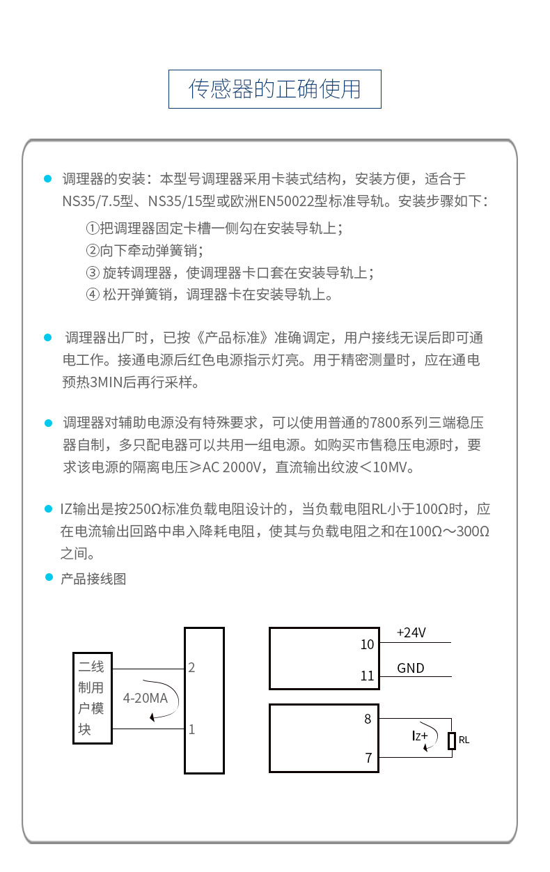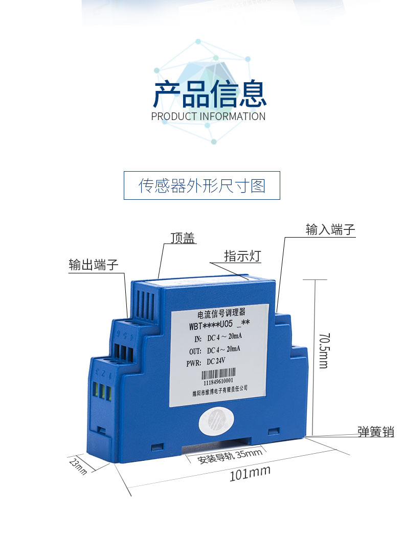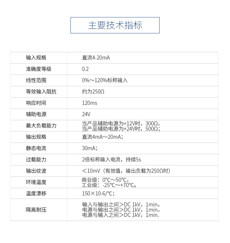 本产品采用线性光电隔离技术,隔离传送4mA~20mA直流电流信号。本产品输路输出和辅助电源相互电隔离,具有高准确度、高隔离、低功耗、低漂移温度范围宽等特点。